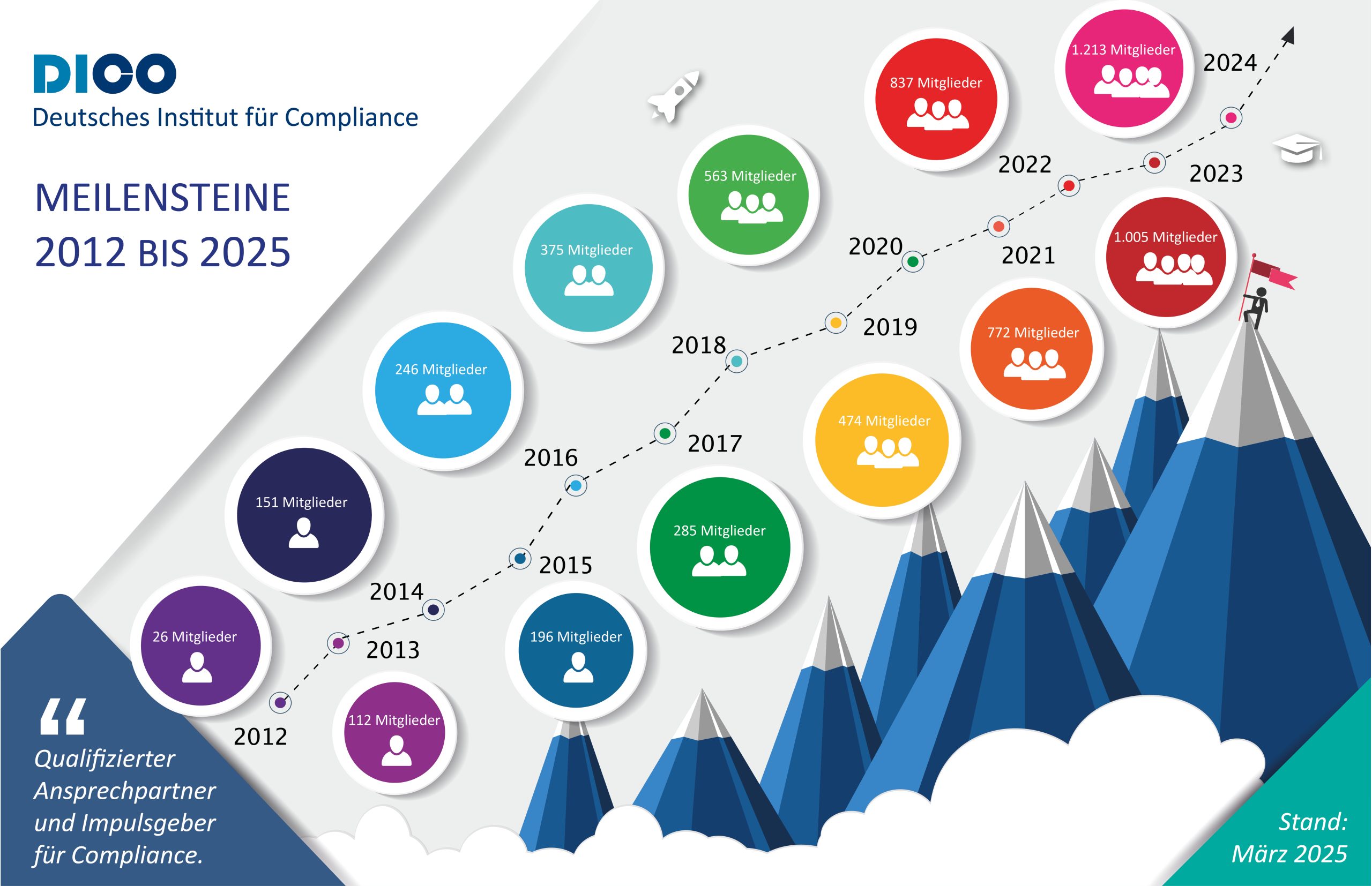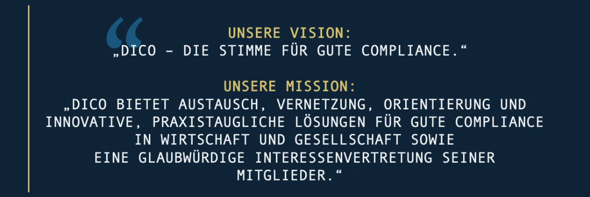 Wir sind DICO – das Deutsche Institut für Compliance e.V. – die Stimme der Compliance in Deutschland. Gegründet im November 2012, auf Betreiben führender Compliance-Praktiker und –Experten. Wir haben als gemeinnütziger Verein inzwischen über 1000 Mitglieder aus allen Branchen in Deutschland, von DAX-Unternehmen, über Unternehmen aus dem Mittelstand, zu